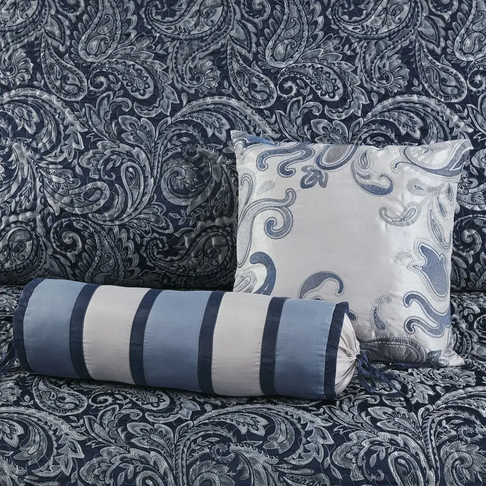 The Madison Park Aubrey 5 Piece Reversible Jacquard Bedspread Set provides a classic update for your bedroom. The jacquard weave is inspired from an updated paisley motif and is woven into a beautiful combination of deep navy, dusty medium blue, and a hint of silver for a touch of sheen to your bedding. The quilted bedspread and shams offer beautiful details with a navy flange and silver piping. The reverse is a dusty blue color, while two decorative pillows feature pleating and embroidery details that coordinate with the top of the bed to bring the entire look together.