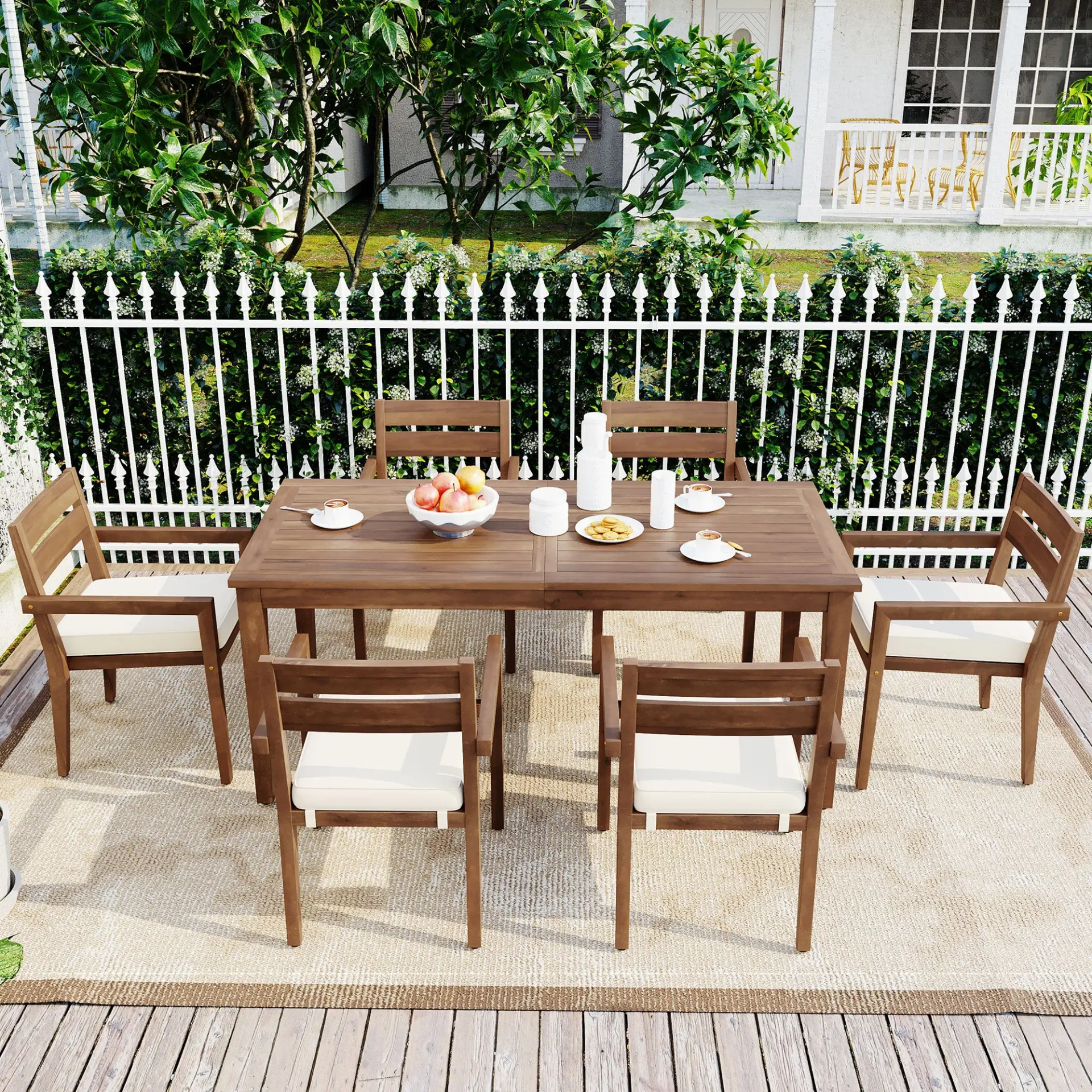 Experience effortless outdoor dining with this premium 7-piece acacia wood dining set, featuring a spacious 70.9-inch table and six comfortable chairs with removable cushions. Built from solid acacia wood, the entire set offers exceptional strength, natural weather resistance, and timeless style that enhances any environment. Each chair includes a detachable cushion with a light water-resistant cover, making cleanup easy and keeping your seating fresh throughout the seasons. When not in use, the chairs stack neatly for simple storagean ideal solution for patios or compact outdoor areas. Designed for versatility, this dining set transitions seamlessly between outdoor and indoor spaces. Whether placed in a garden, lawn, patio, poolside deck, or indoor dining room, it creates a warm, welcoming space for family meals, celebrations, and everyday relaxation. Built for durability and comfort, its the perfect addition for year-round living and entertaining.