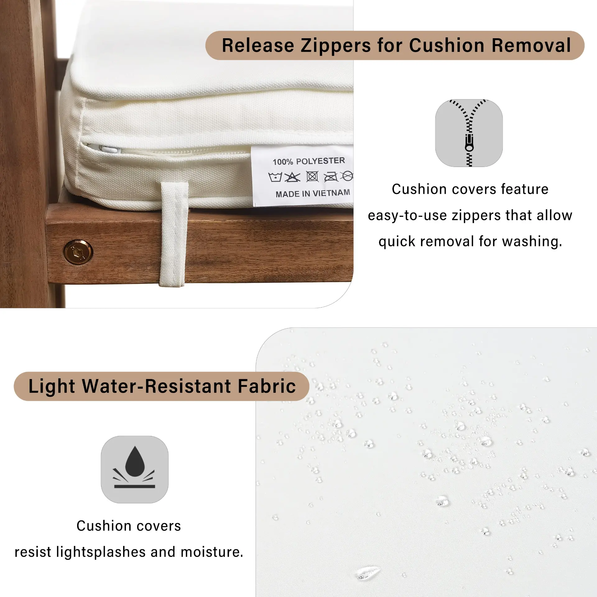 - [Water-Resistant]:Cushion covers feature light water resistance while the acacia wood frame holds up well in outdoor environments. The entire set is built to handle garden moisture, poolside humidity, and daily outdoor exposure.