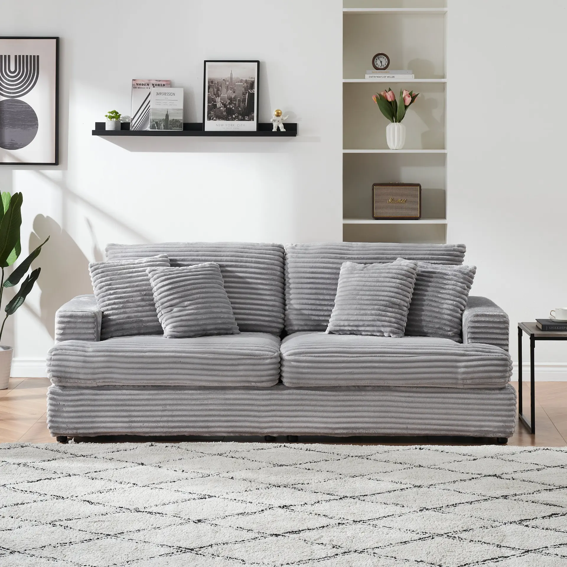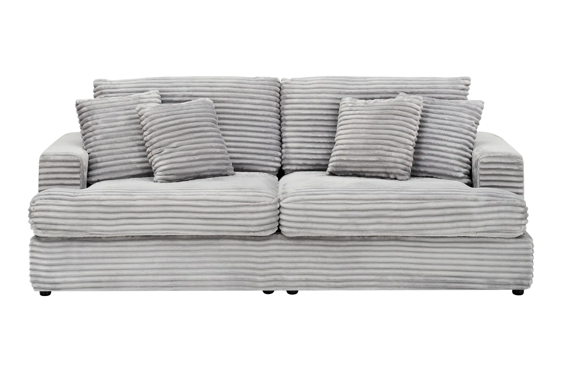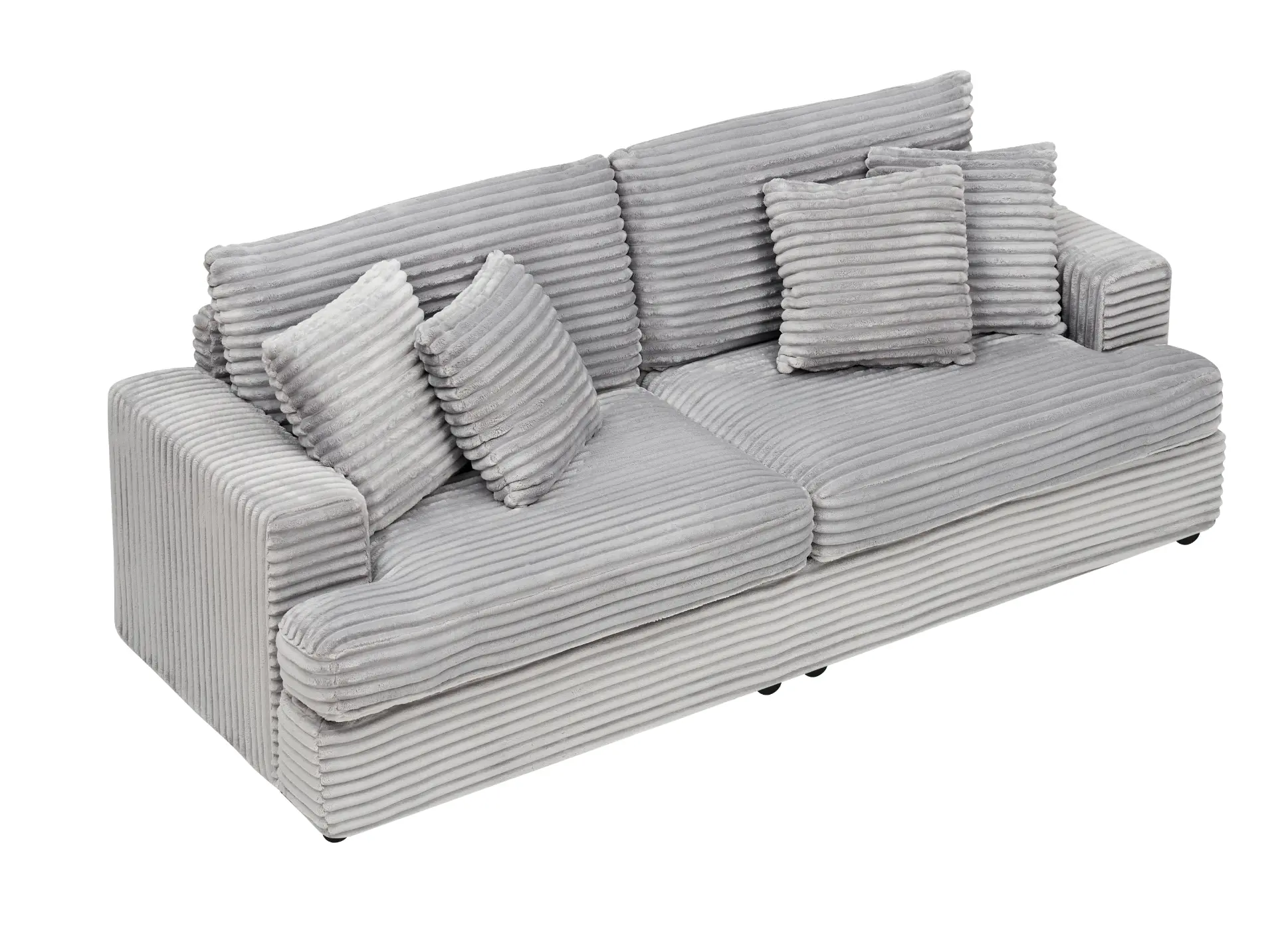 Bring modern minimalist style and everyday comfort to your home with this spacious corduroy sofa designed for living rooms, apartments, offices, and reception areas. The ultra-soft, skin-friendly corduroy upholstery adds a refined, tactile look while offering durability, fade resistance, and good wrinkle resistance for long-lasting use. The wide seat depth supports sitting, reclining, or lying down, making it ideal for relaxing, entertaining, or watching TV. Comfort is reinforced with an individual spring wrap seat cushion and supportive sponge-filled backrest and cushions, helping the seat stay soft and resilient without collapsing over time. A sturdy frame combines solid wood and wood-based panels, paired with durable plastic feet for stable, everyday performance. It includes four matching toss pillows for extra lounging comfort, and the pillowcases are removable and washable for easier upkeep. Assembly is simple with included hardware and step-by-step instructions—no additional tools required. For routine care, wipe clean with a dry cloth.