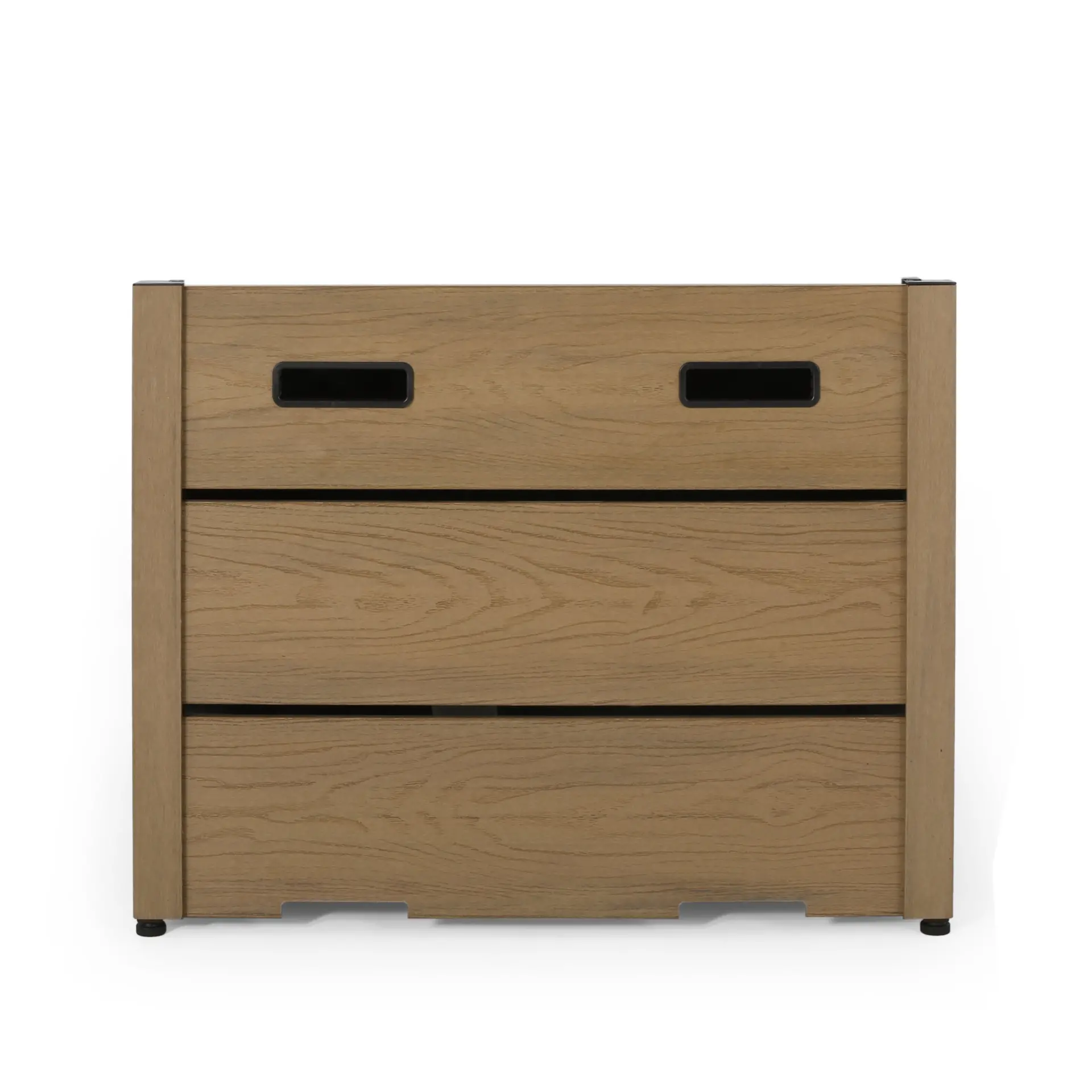 - WPC BASE: Using a unique WPC (WOOD-PLASTIC COMPOSITES) base, this synthetic wood offers the aesthetics and textures of real wood without the high upkeep. This is finished with a slat panel design for a rustic look and handles for easy transport.