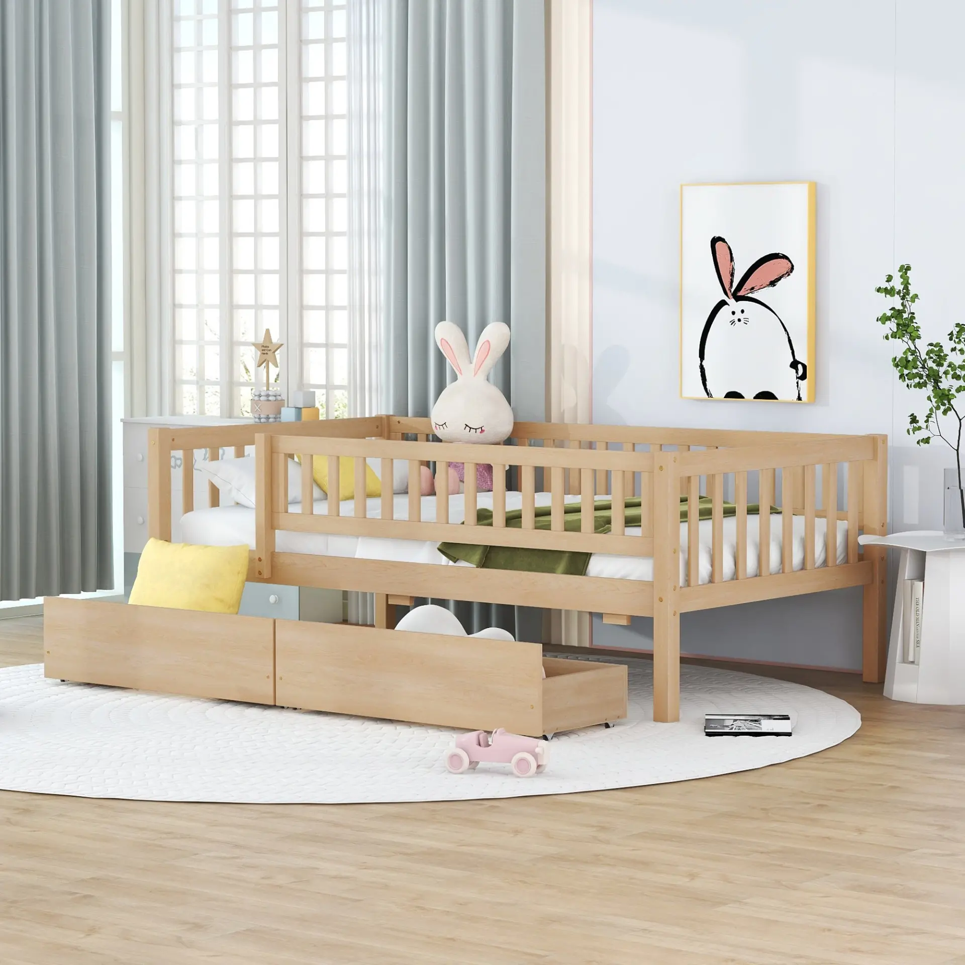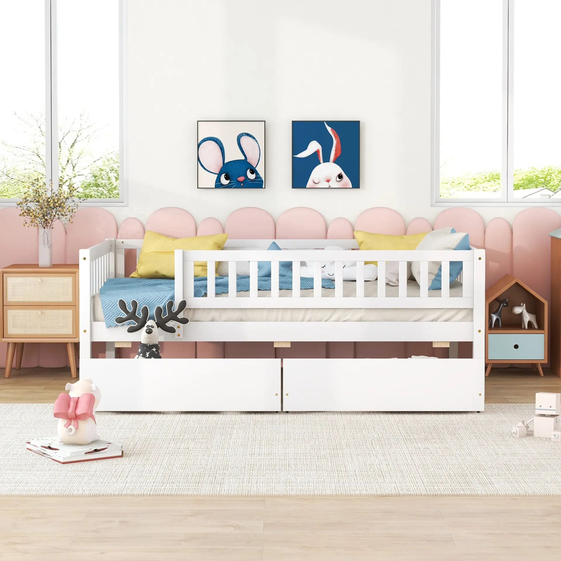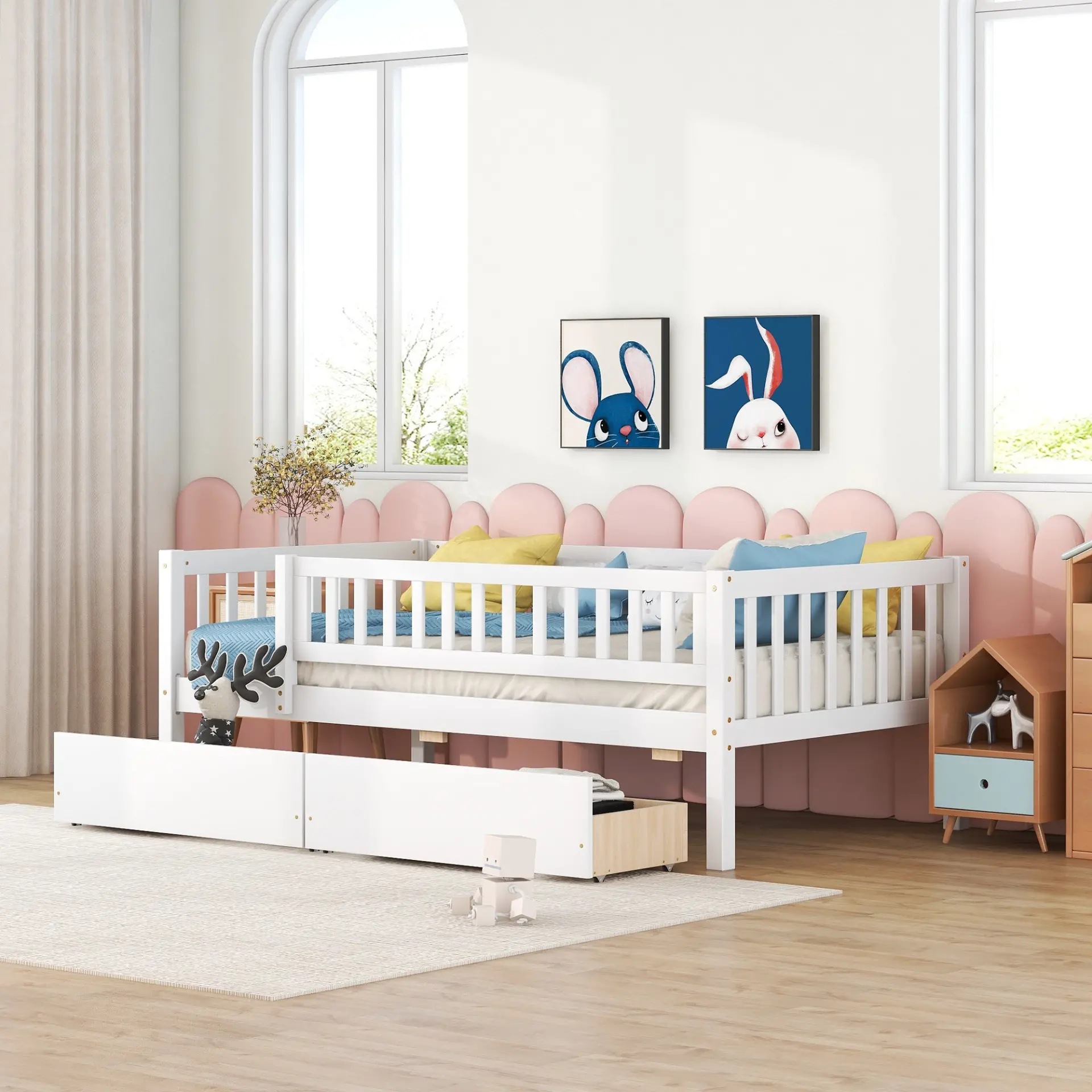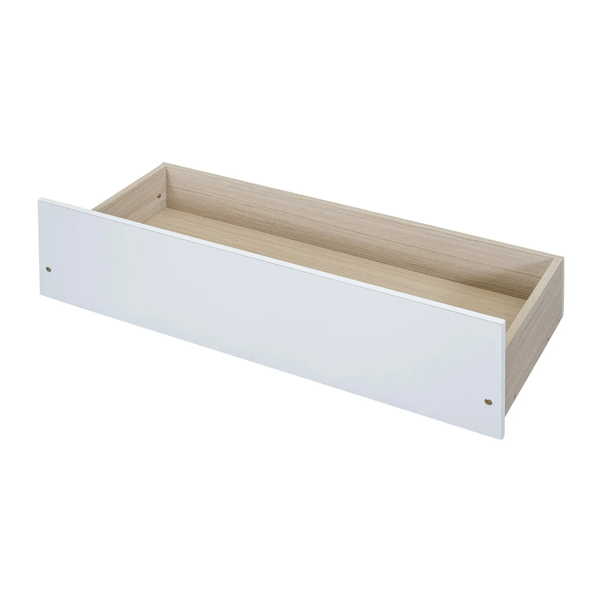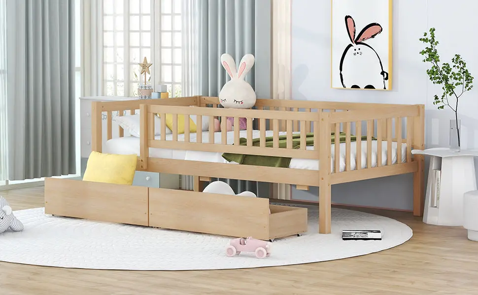 • Two built-in drawers provide space-saving underbed storage for a tidier room.