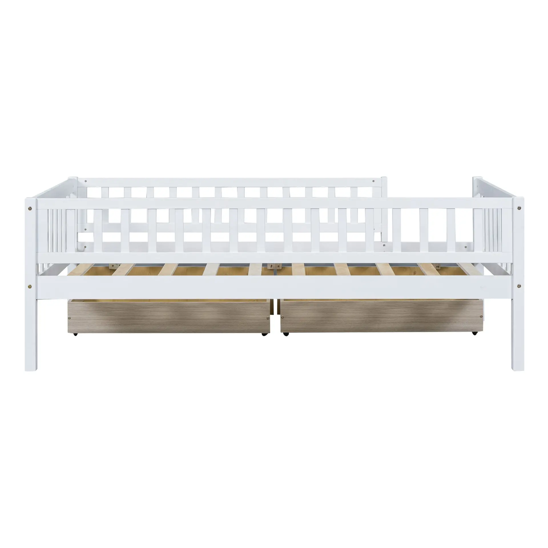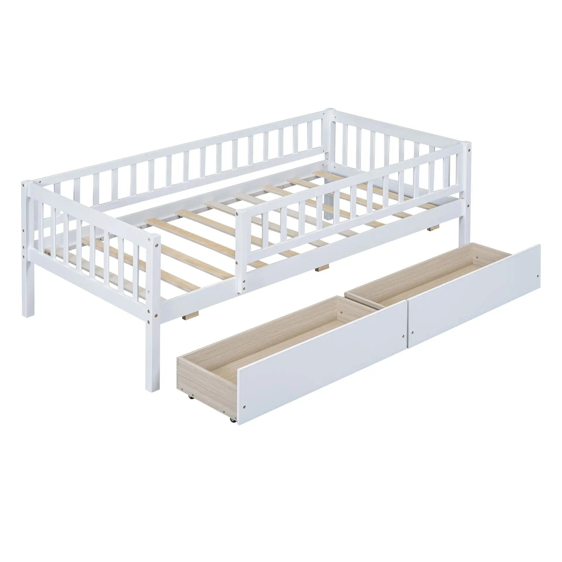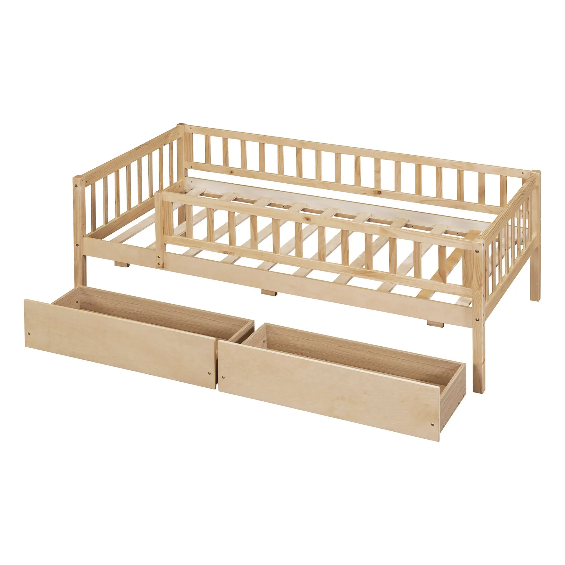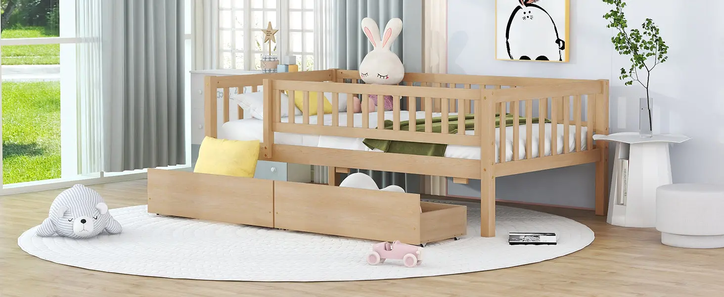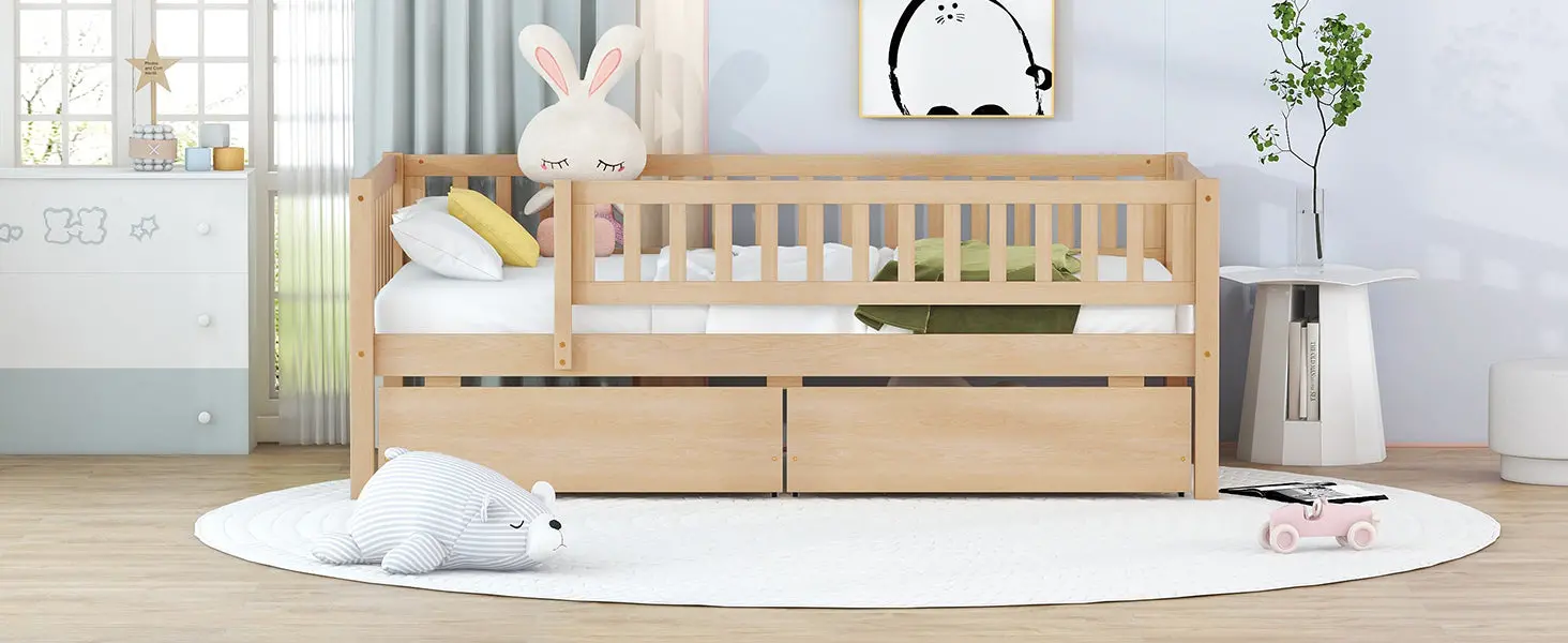 Upgrade any room with a versatile solid wood daybed frame that works beautifully as a comfortable seating option by day and a reliable sleeping space by night. Crafted from high-quality pine wood, the sturdy wooden bed frame is designed to resist humidity-related cracking, while strong legs, wide boards, and 10 supportive slats help deliver excellent stability, reduced noise, and dependable performance for years. Two smooth-gliding drawers add smart underbed storageideal for keeping books, toys, linens, and everyday essentials neatly tucked away, making this space-saving daybed a perfect fit for small living spaces, guest rooms, and multi-purpose areas. Clear instructions and included hardware make assembly straightforward (two people recommended). Mattress not included.