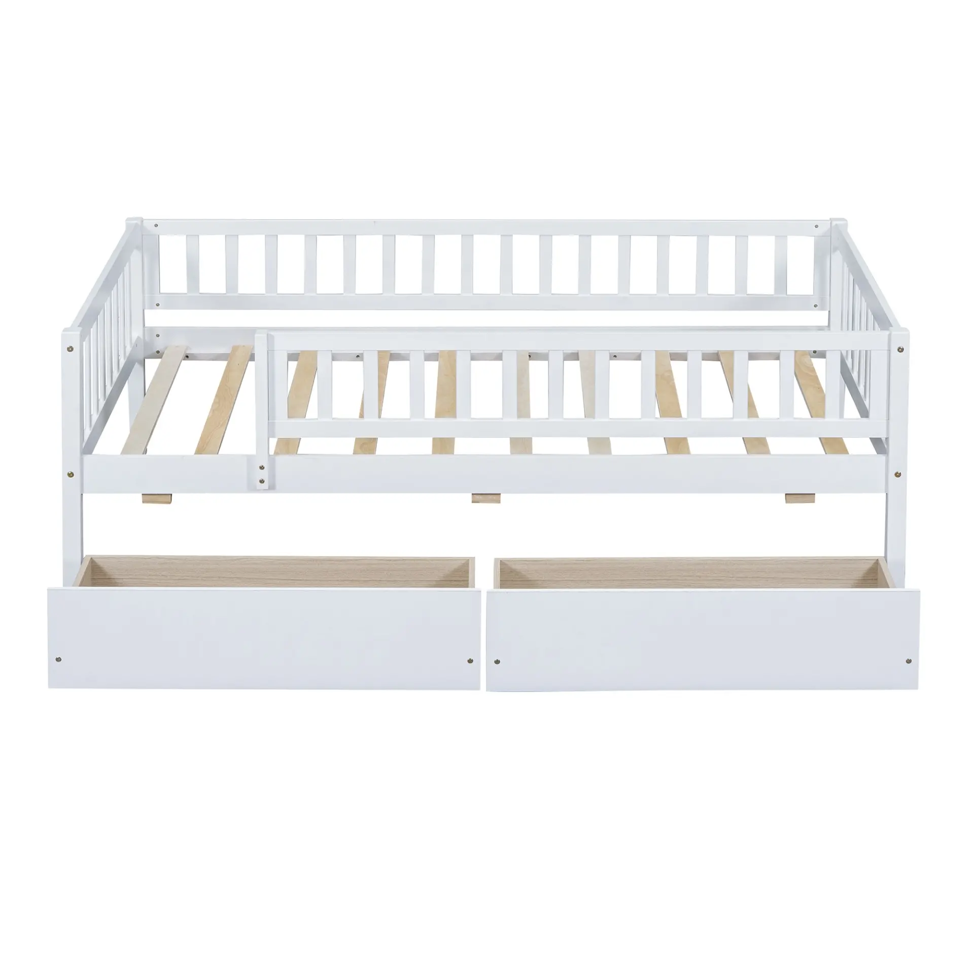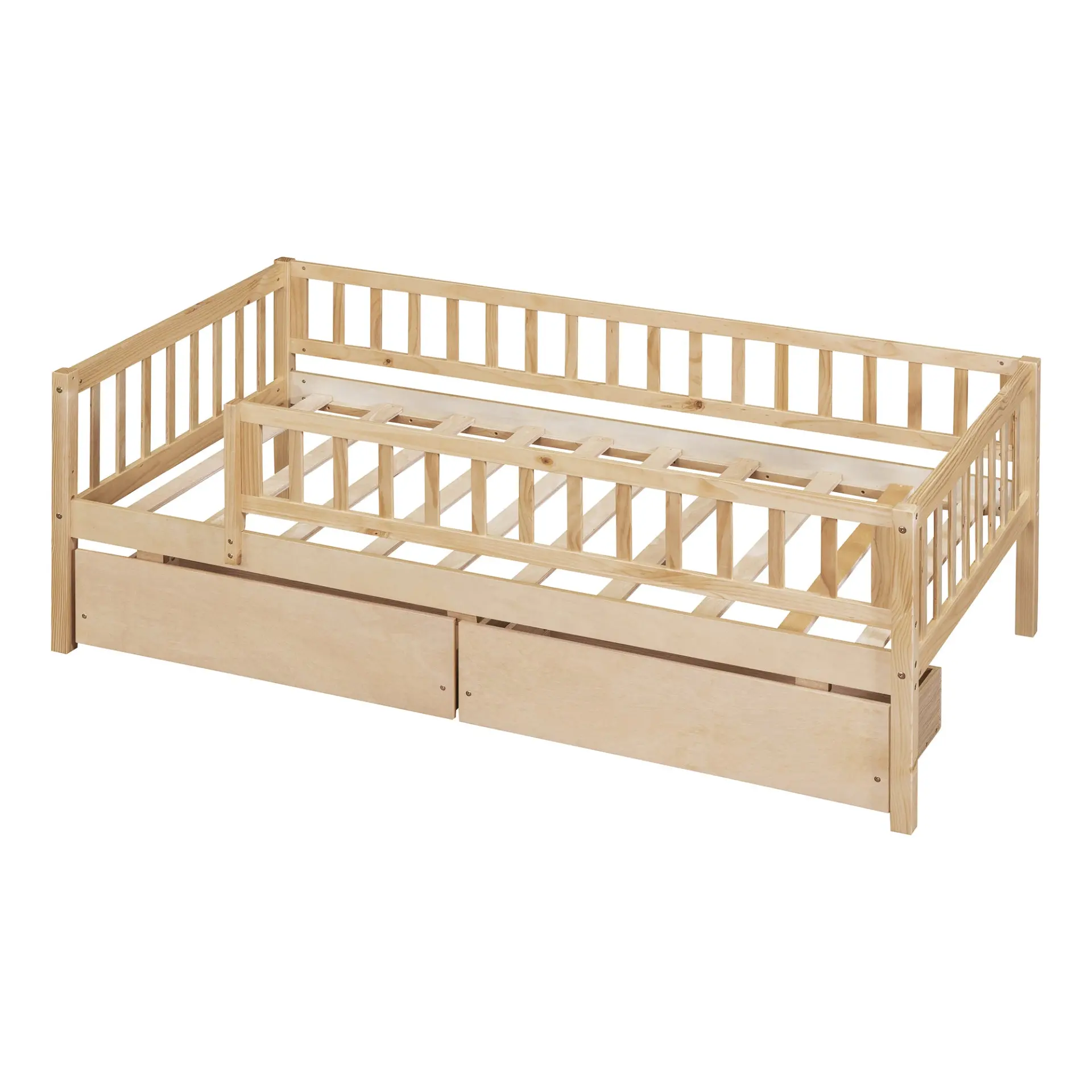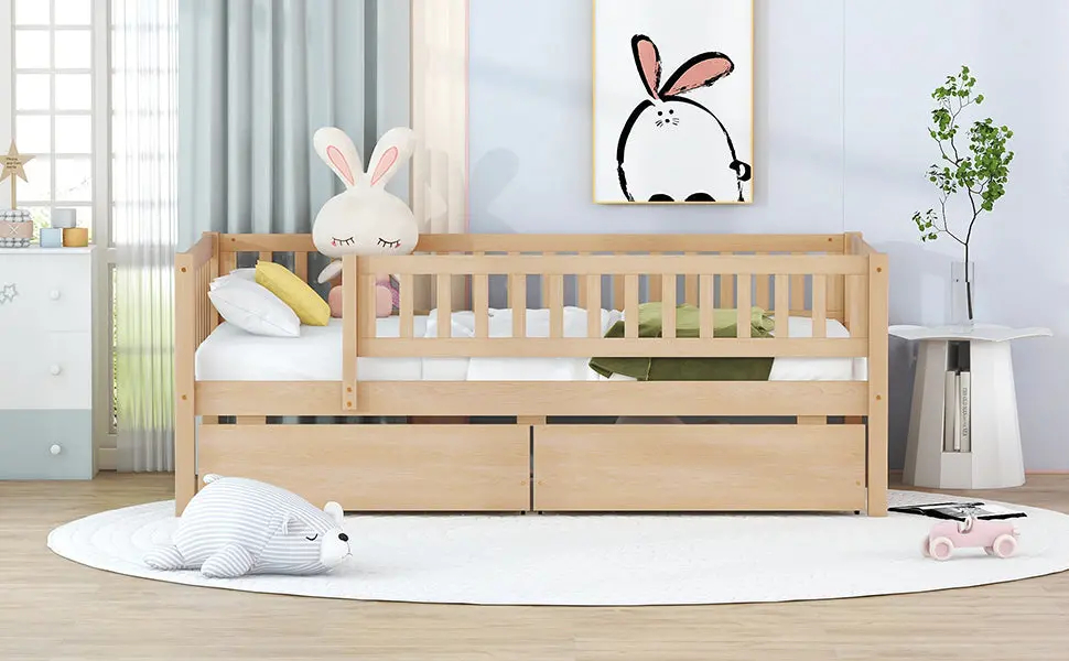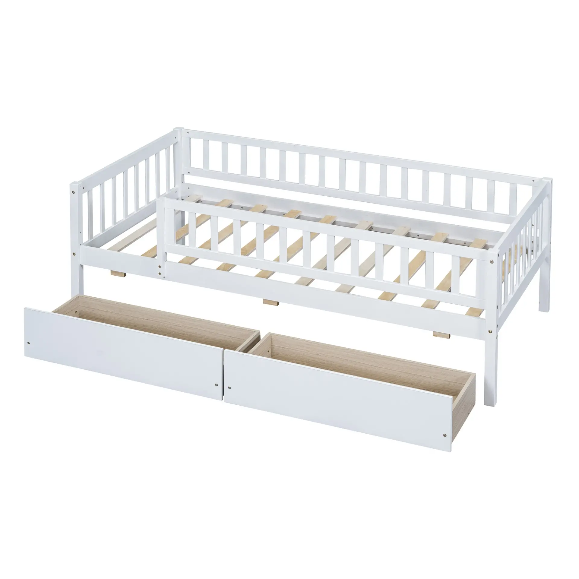 Upgrade any room with a versatile solid wood daybed frame that works beautifully as a comfortable seating option by day and a reliable sleeping space by night. Crafted from high-quality pine wood, the sturdy wooden bed frame is designed to resist humidity-related cracking, while strong legs, wide boards, and 10 supportive slats help deliver excellent stability, reduced noise, and dependable performance for years. Two smooth-gliding drawers add smart underbed storageideal for keeping books, toys, linens, and everyday essentials neatly tucked away, making this space-saving daybed a perfect fit for small living spaces, guest rooms, and multi-purpose areas. Clear instructions and included hardware make assembly straightforward (two people recommended). Mattress not included.
