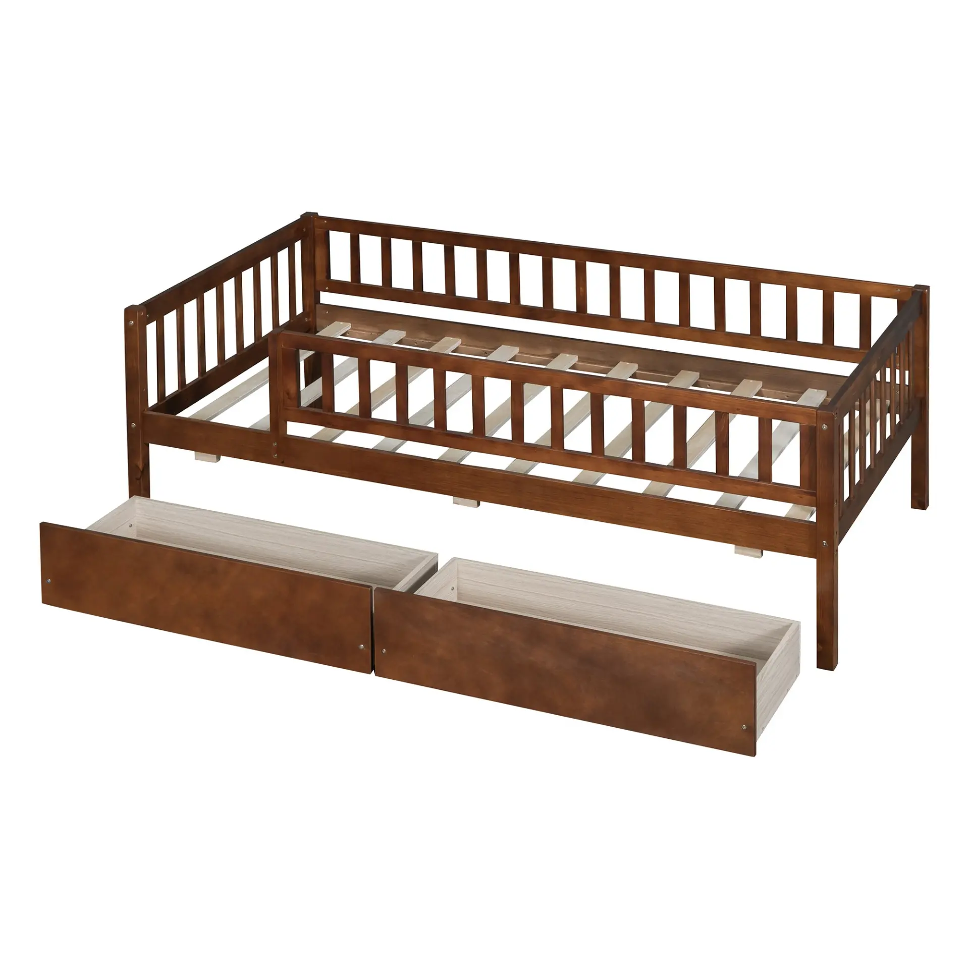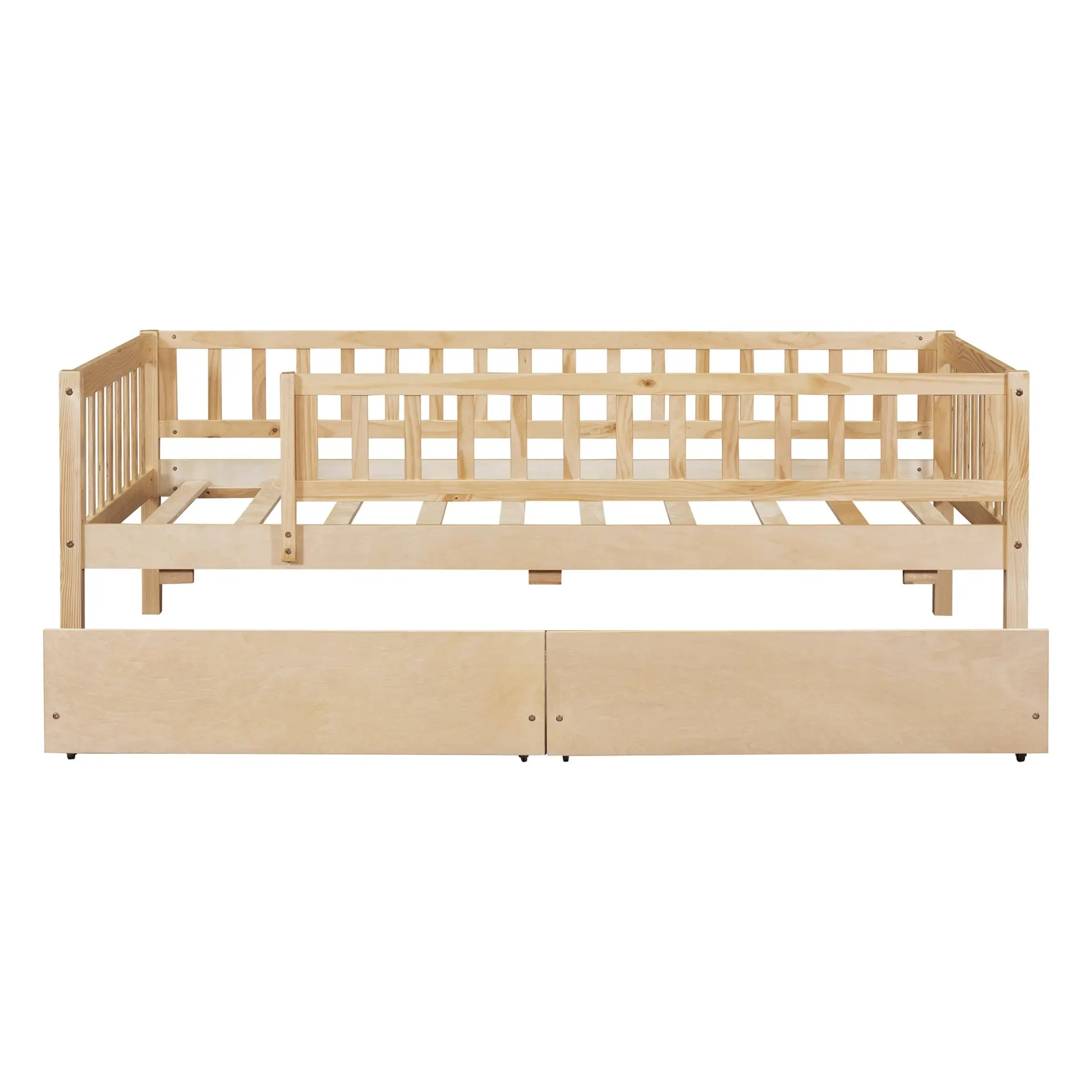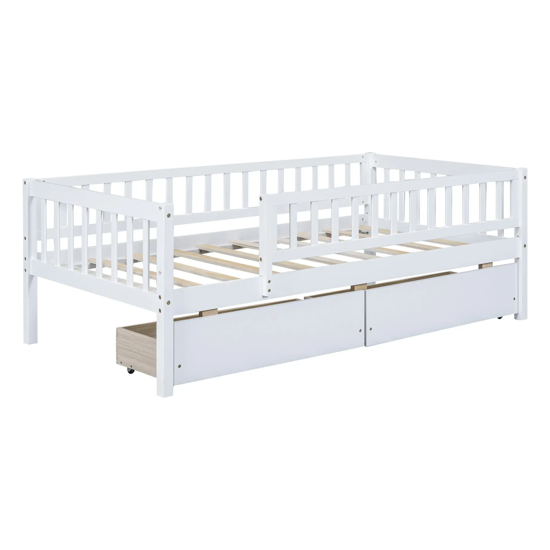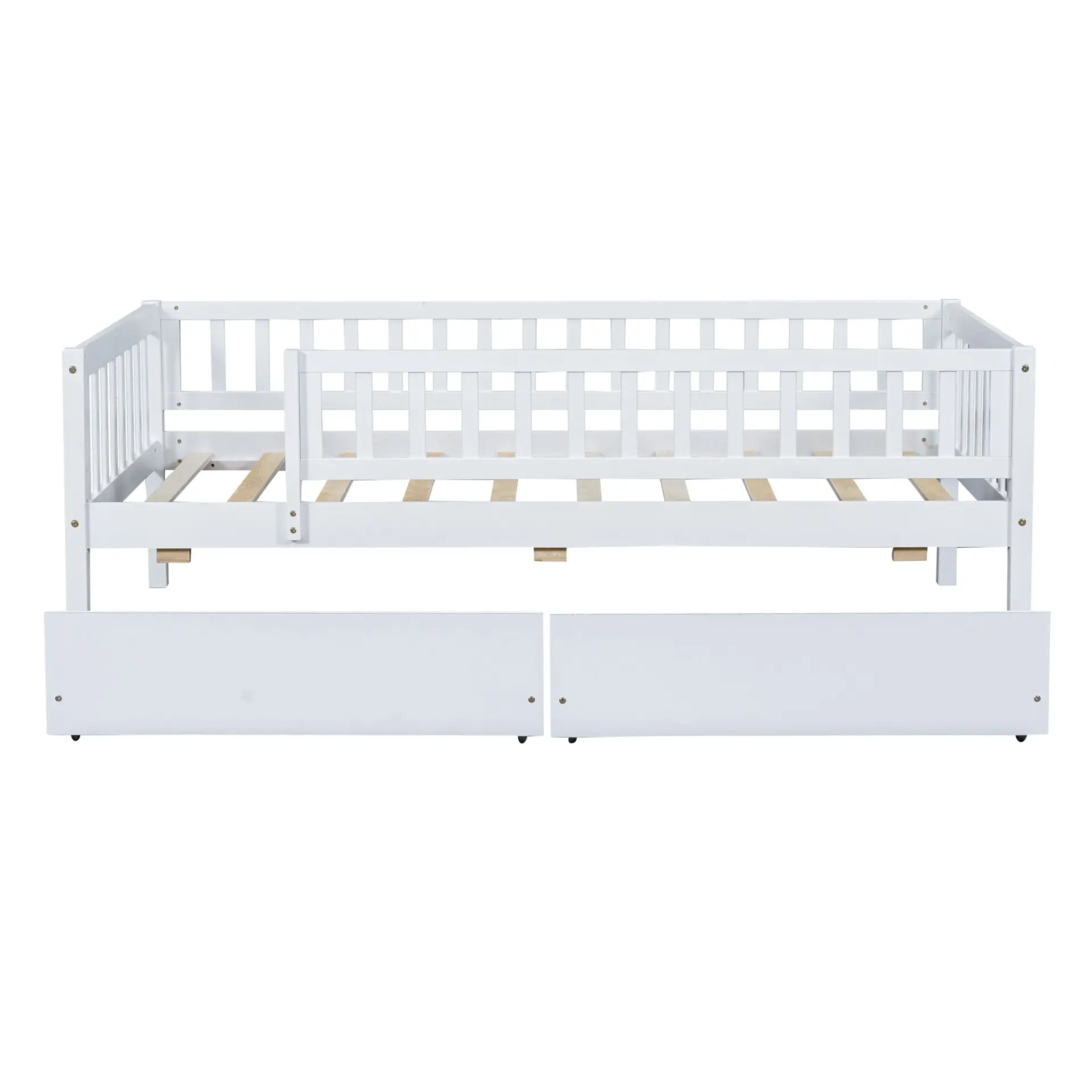 Upgrade any room with a versatile solid wood daybed frame that works beautifully as a comfortable seating option by day and a reliable sleeping space by night. Crafted from high-quality pine wood, the sturdy wooden bed frame is designed to resist humidity-related cracking, while strong legs, wide boards, and 10 supportive slats help deliver excellent stability, reduced noise, and dependable performance for years. Two smooth-gliding drawers add smart underbed storageideal for keeping books, toys, linens, and everyday essentials neatly tucked away, making this space-saving daybed a perfect fit for small living spaces, guest rooms, and multi-purpose areas. Clear instructions and included hardware make assembly straightforward (two people recommended). Mattress not included.