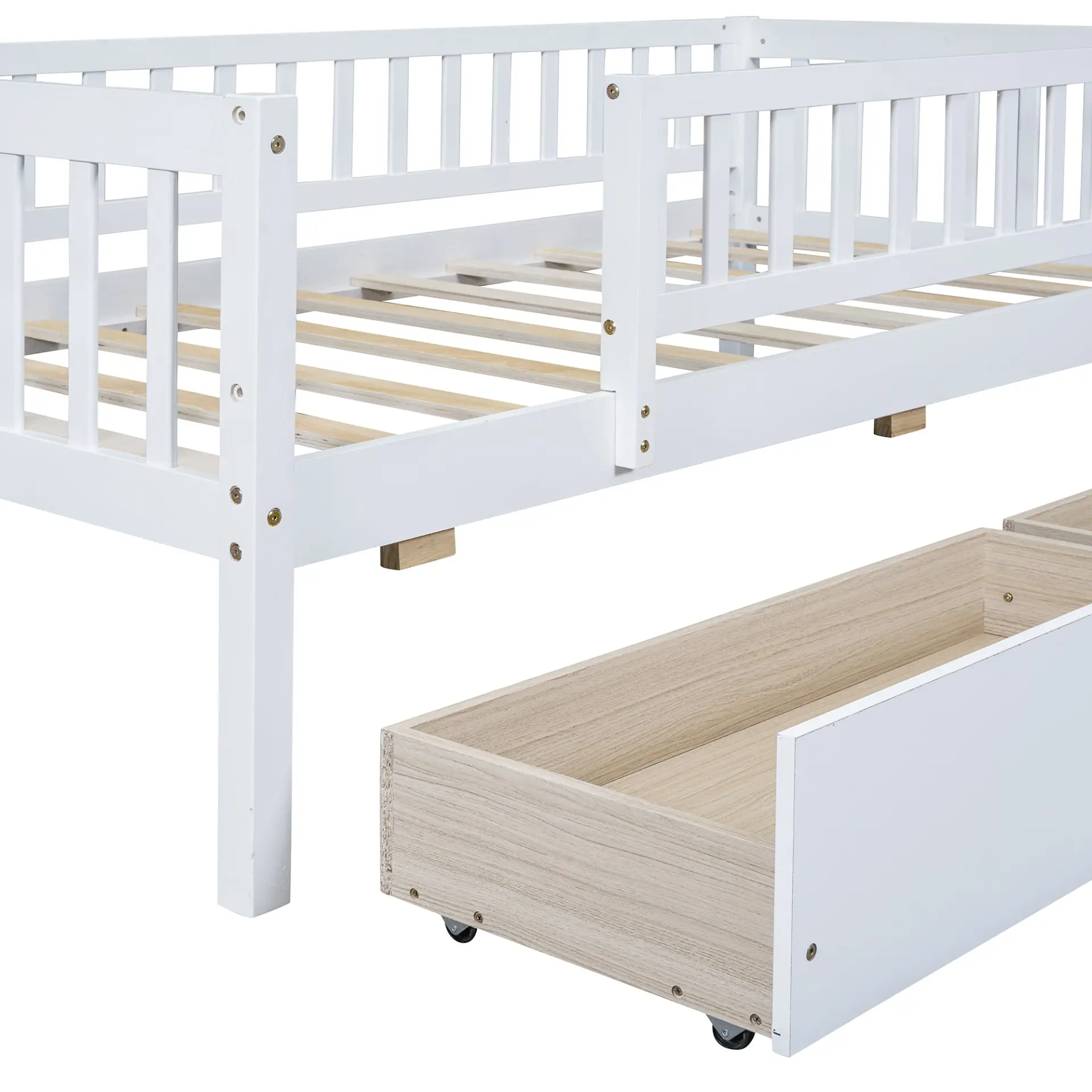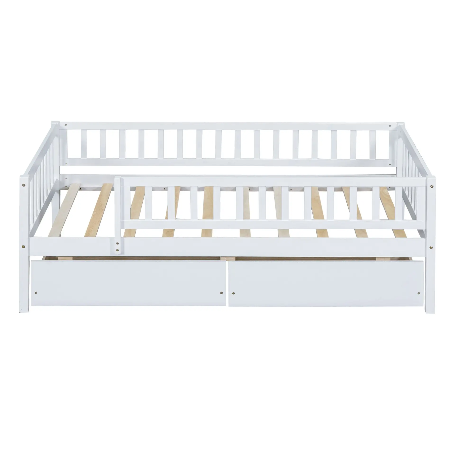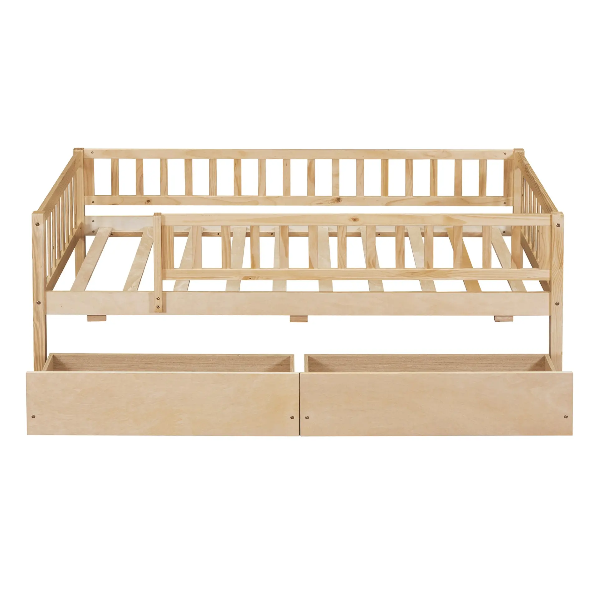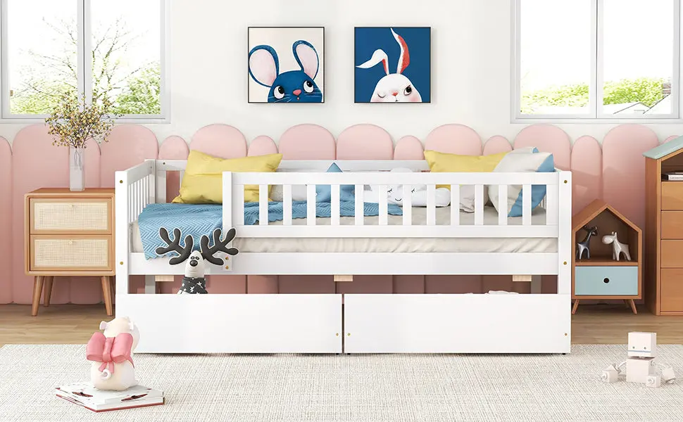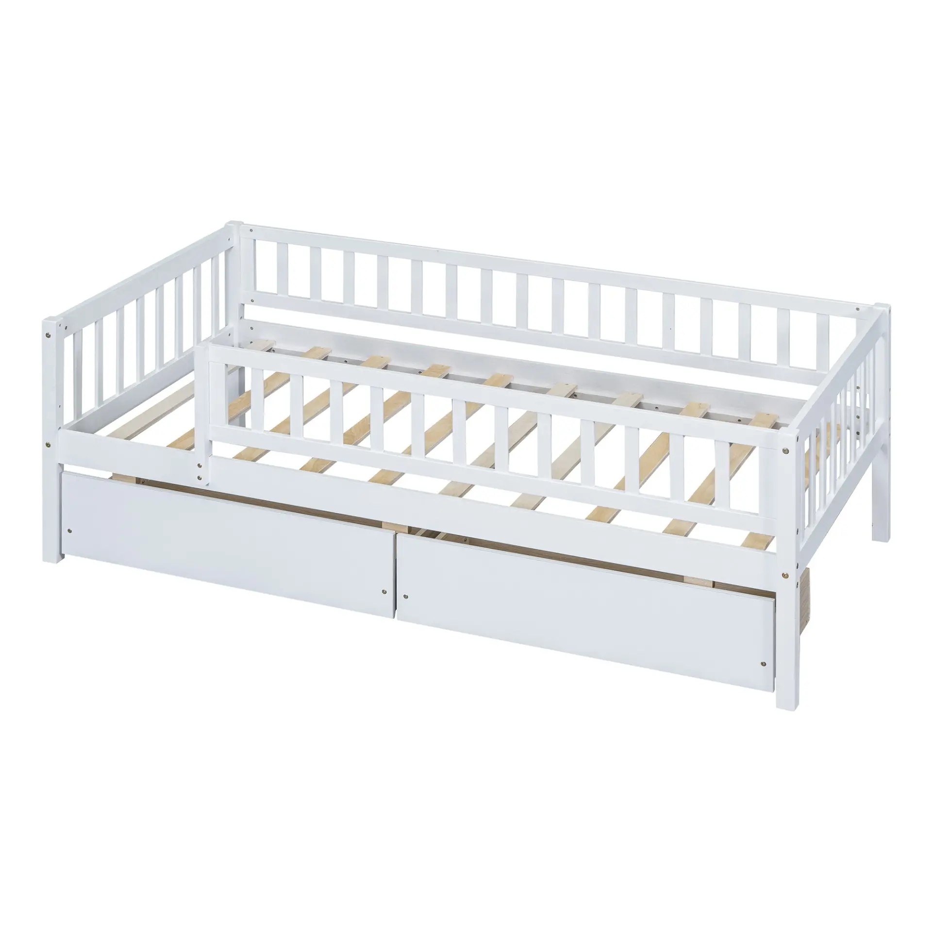 Upgrade any room with a versatile solid wood daybed frame that works beautifully as a comfortable seating option by day and a reliable sleeping space by night. Crafted from high-quality pine wood, the sturdy wooden bed frame is designed to resist humidity-related cracking, while strong legs, wide boards, and 10 supportive slats help deliver excellent stability, reduced noise, and dependable performance for years. Two smooth-gliding drawers add smart underbed storageideal for keeping books, toys, linens, and everyday essentials neatly tucked away, making this space-saving daybed a perfect fit for small living spaces, guest rooms, and multi-purpose areas. Clear instructions and included hardware make assembly straightforward (two people recommended). Mattress not included.